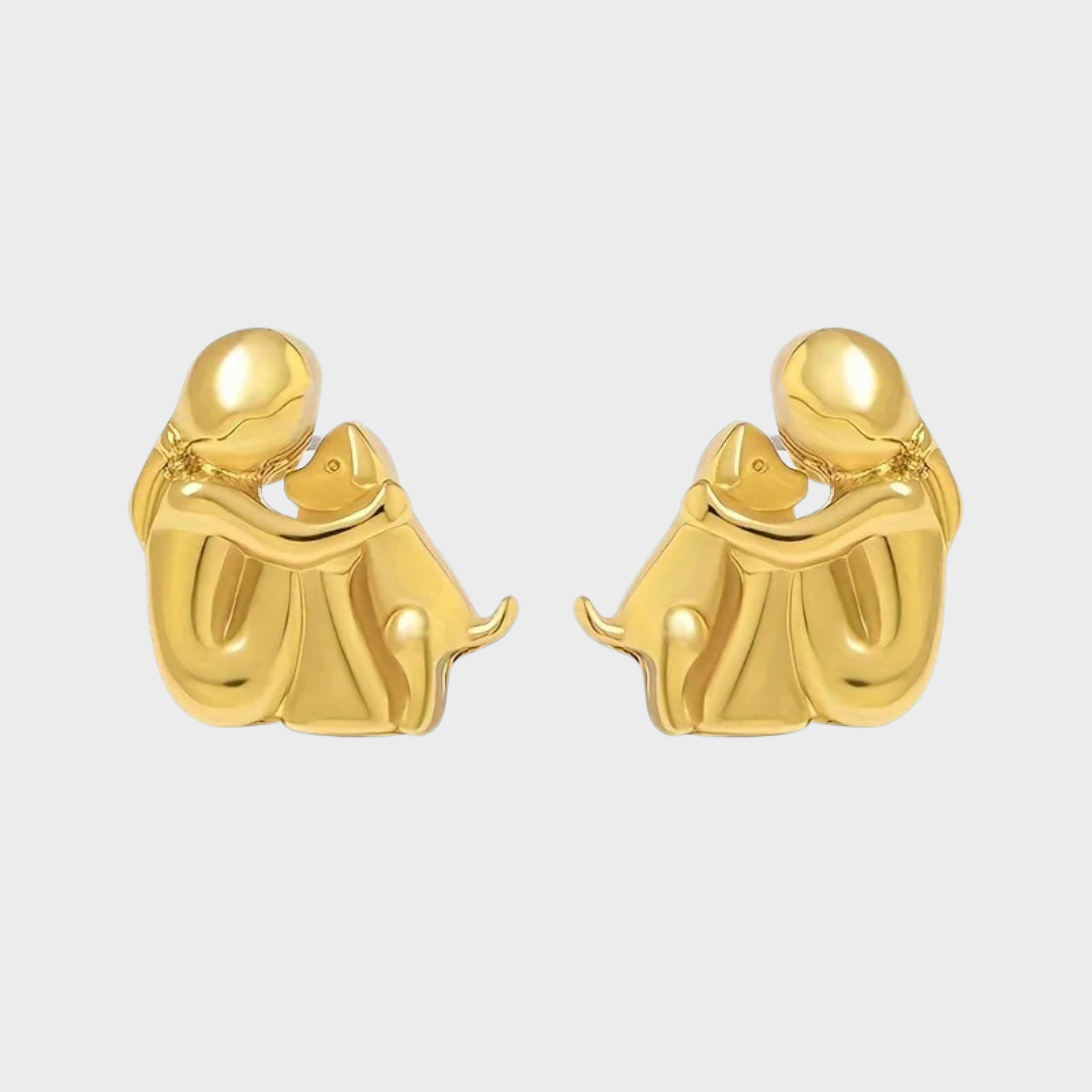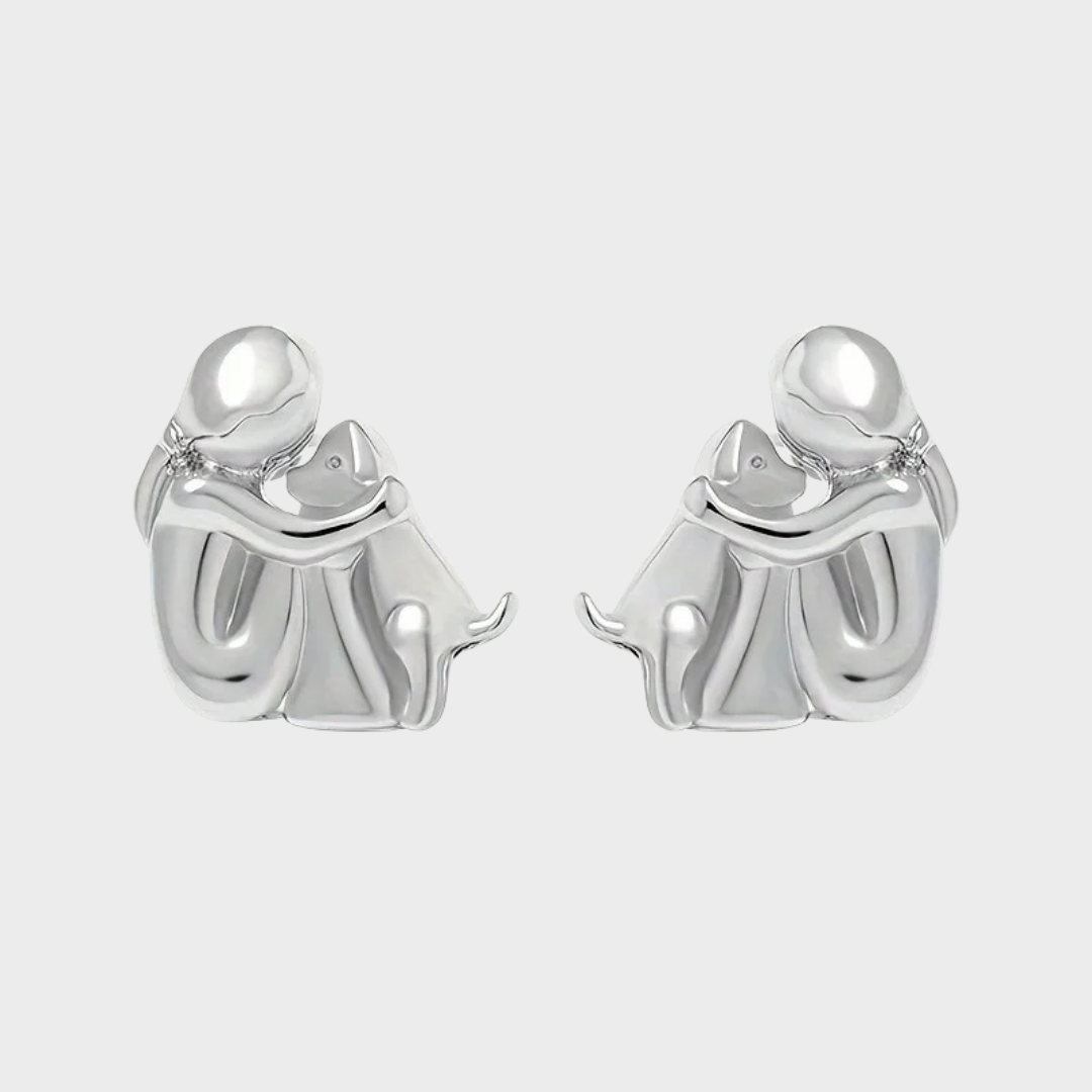 Тези чаровни обеци с уникален дизайн на момиче, което прегръща своето куче, символизират чиста любов и безусловно приятелство. В елегантни сребристо-златни нюанси, те са перфектни за всеки, който пази своите пухкави приятели близо до сърцето си.