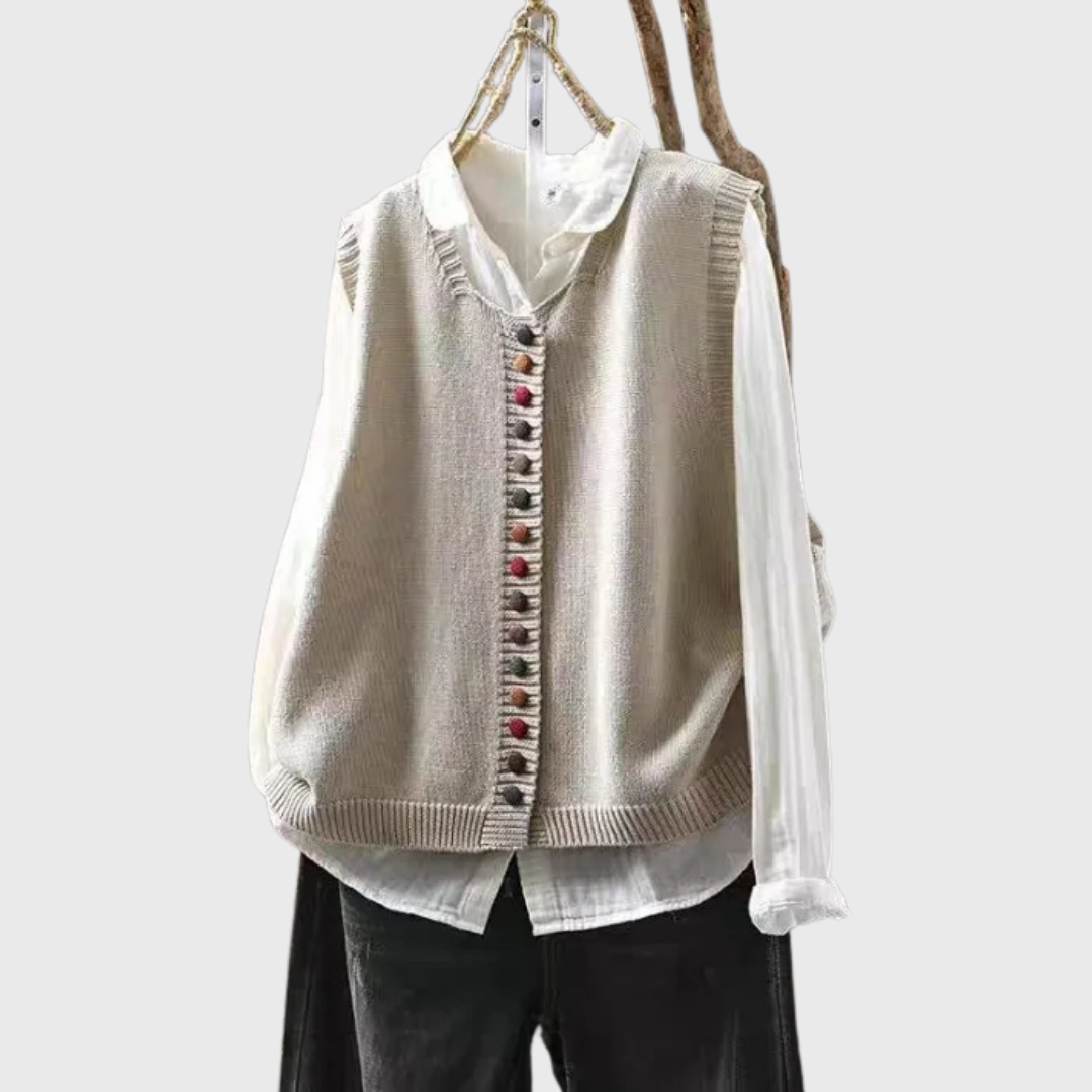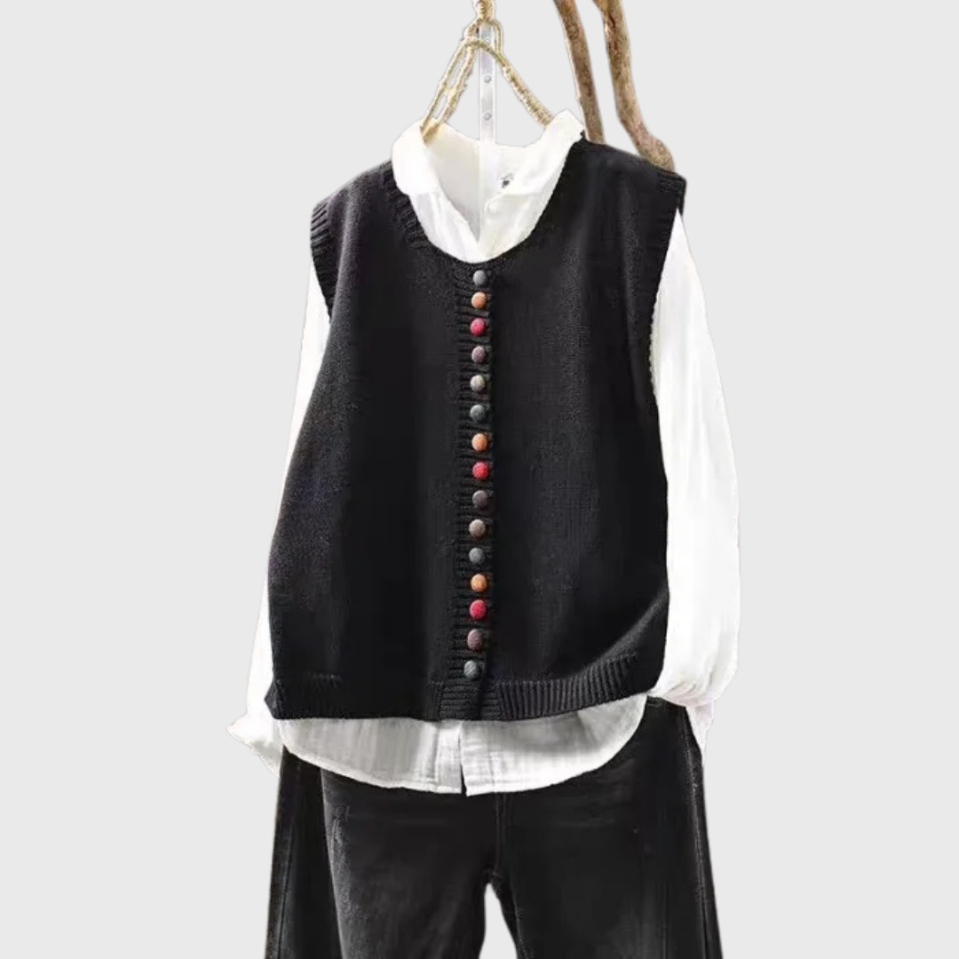 Добавете щрих на стил и оригиналност към визията си с този очарователен елек! Универсалният дизайн се съчетава перфектно с ризи, блузи и рокли, създавайки модерни и изпълнени с индивидуалност комбинации. Акцентът е редицата от различни копчета, които придават ръчно изработен чар и автентична визия. Идеален е за онези, които търсят непринудена елегантност и комфорт при всякакъв повод.