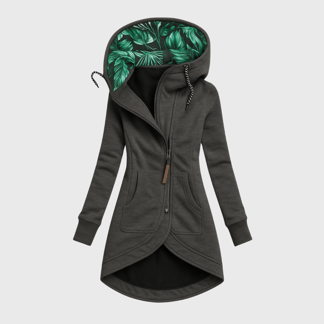 Това дамско палто съчетава модерност и практичност в уникален и впечатляващ дизайн. Широката качулка с вътрешен принт придава неустоим моден акцент, а удълженият гръб осигурява елегантна и удобна кройка. Идеален избор за всеки, който търси универсална, стилна и подходяща за всякакви поводи дреха.