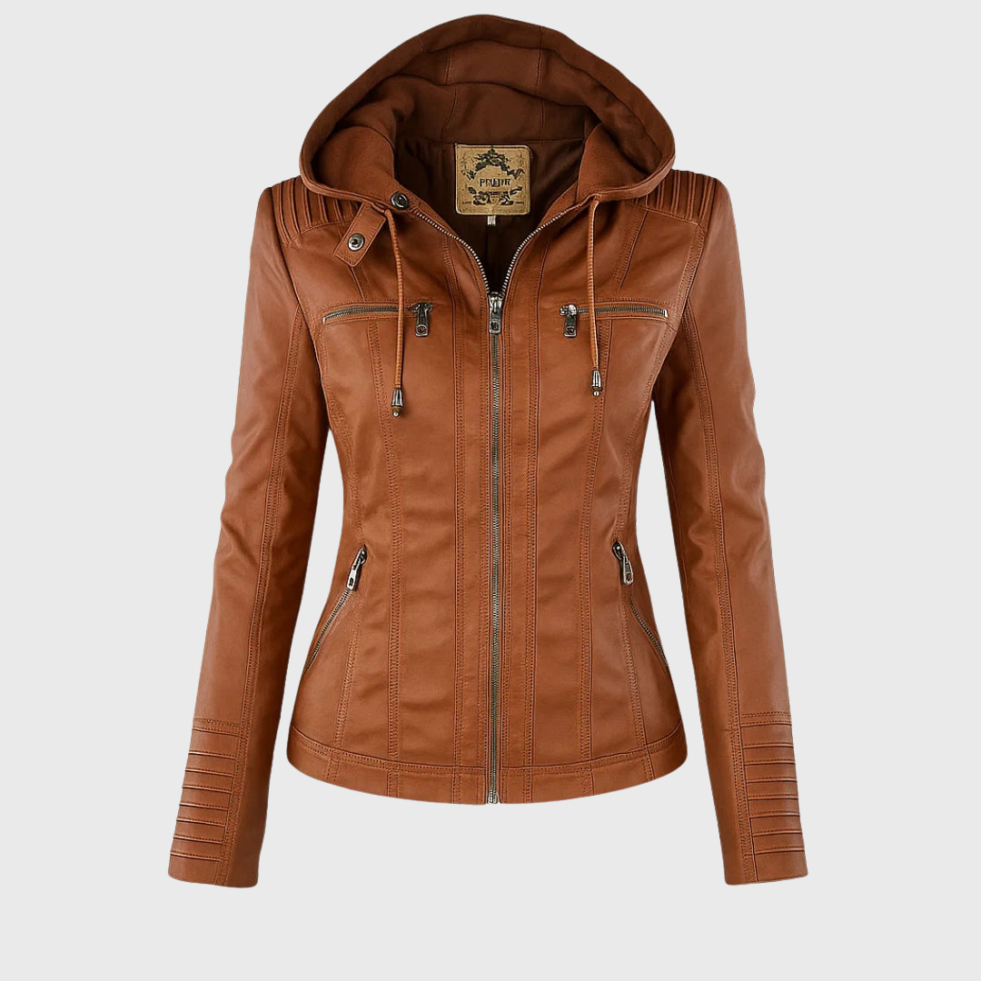 Това дамско яке съчетава модерност и елегантност в прилепнал дизайн, който подчертава силуета. С подвижна качулка и преден цип то предлага практичност, без да жертва стила. Детайлите по раменете и ръкавите добавят индивидуалност и модерен акцент, което го прави перфектен избор за впечатляващи визии както през деня, така и вечер.