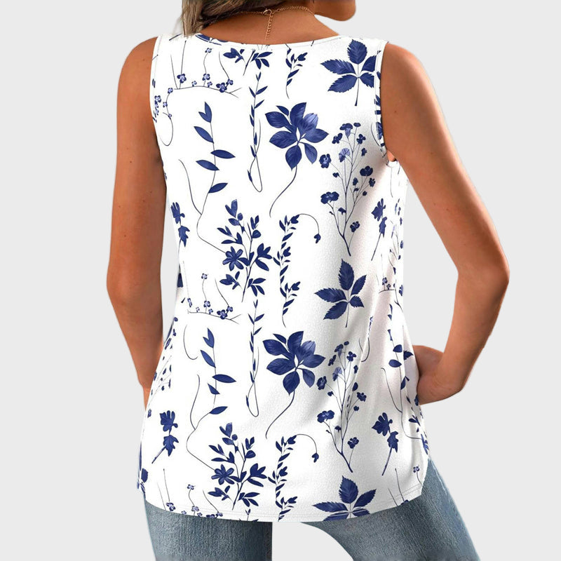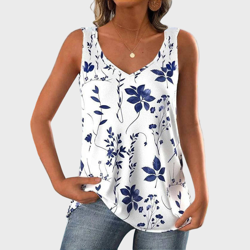 Насладете се на свежестaта на лятото с тази безръкава тениска на бяла основа, украсена с сини цветни мотиви. Нейната небрежна силуета предлага комфорт и свобода на движение, докато V-образното деколте добавя женственост и елегантност. Идеална е за ежедневни и летни комбинации.