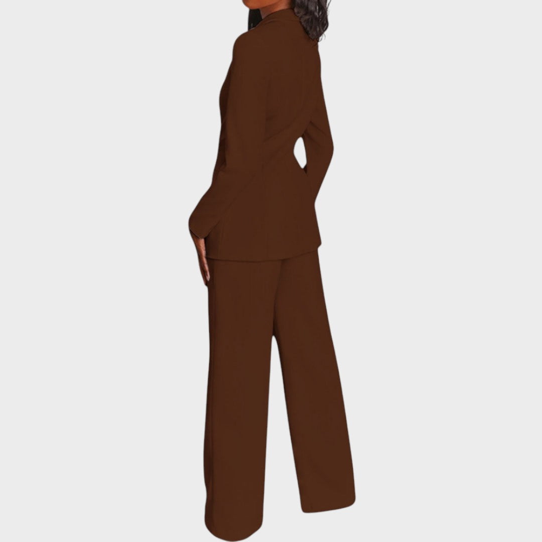 Дамски костюм, който съчетава изтънченост и модерен стил. Дългото сако с остри ревери, закопчаване с един копчета и джобове с капак красиво определя талията и визуално удължава фигурата. Панталоните са прави, с леко широки крачоли и гладка линия, осигуряваща чист, удължен профил и свобода на движение. Тъканта с красив драпиране предлага комфорт от сутрешната среща до вечерния излаз. Може да се носи като комплект или отделно – еднакво силно в офиса, на събитие или за официална вечеря.