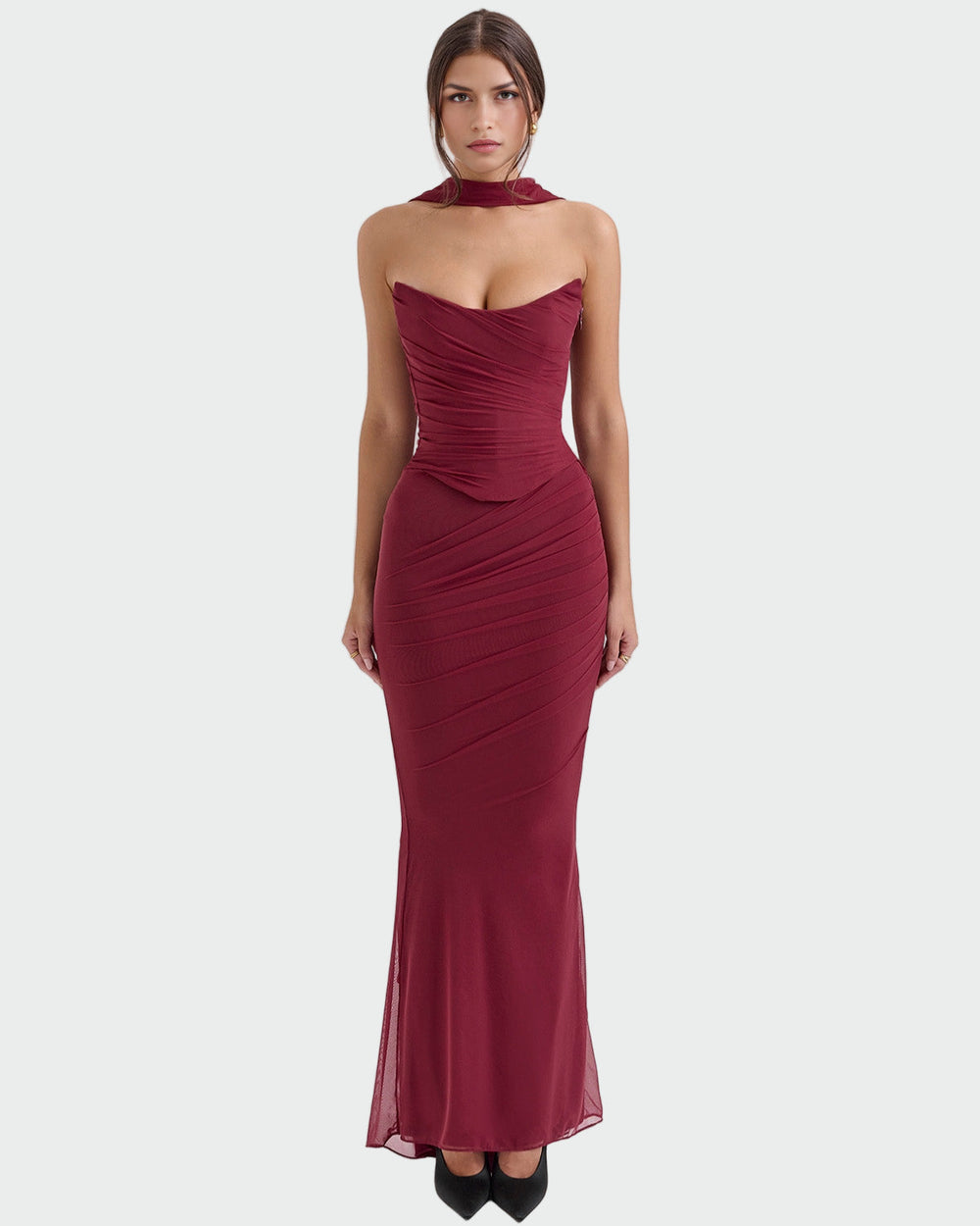 Елегантна и забележителна рокля без презрамки с прилепнал силует, който подчертава фигурата. Драпирани детайли на деколтето и връзване в стил корсет в талията добавят женственост и лукс, докато макси дължината предлага безвременна изтънченост. Идеална за вечерни излизания и тържествени поводи.