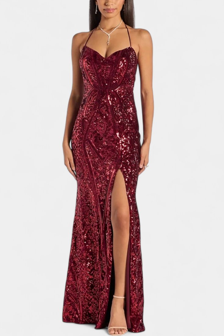 Очарователна силует, който излъчва магнетизъм и изтънченост. Марияна се отличава с халтер дизайн, който подчертава фигурата и блестящ завършек от пайети, който улавя всеки отблясък на светлината. Нейният ласкателен крой прави роклята перфектен избор за да бъдете в центъра на вниманието.