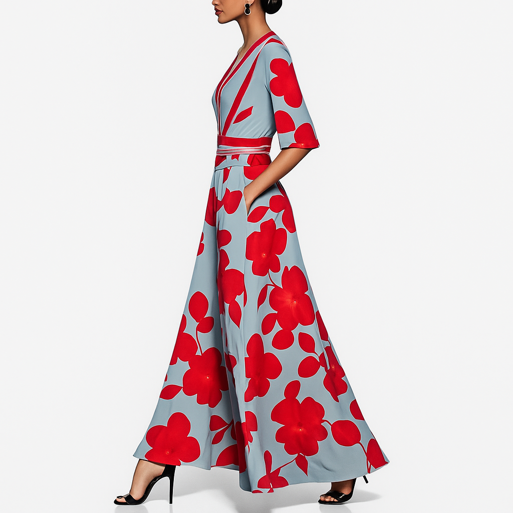 Забележителна макси рокля с дълбоко V-образно деколте и кимоно ръкави, създаваща изискана, издължена силуета. Подчертаният колан определя талията, докато разкошната, летяща пола с преден разрез придава драматично движение при всяка крачка. Практичните странични джобове са дискретно скрити в шева за доза ежедневна функционалност. Идеална за сватби, коктейли и всички специални поводи, когато искаш да изглеждаш уникално.