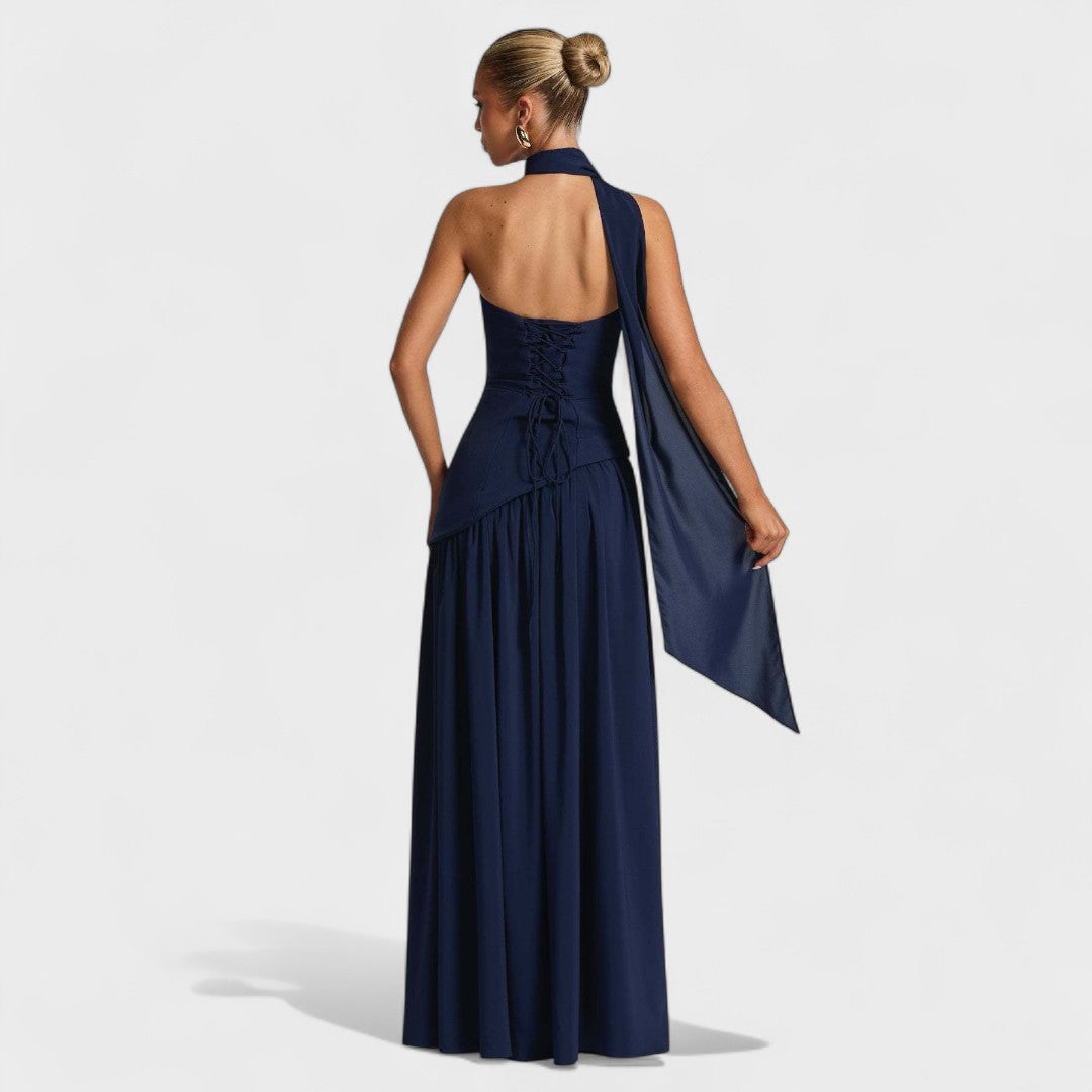 Тясната горна част подчертава талията и деколтето, създавайки елегантна и мощна линия.